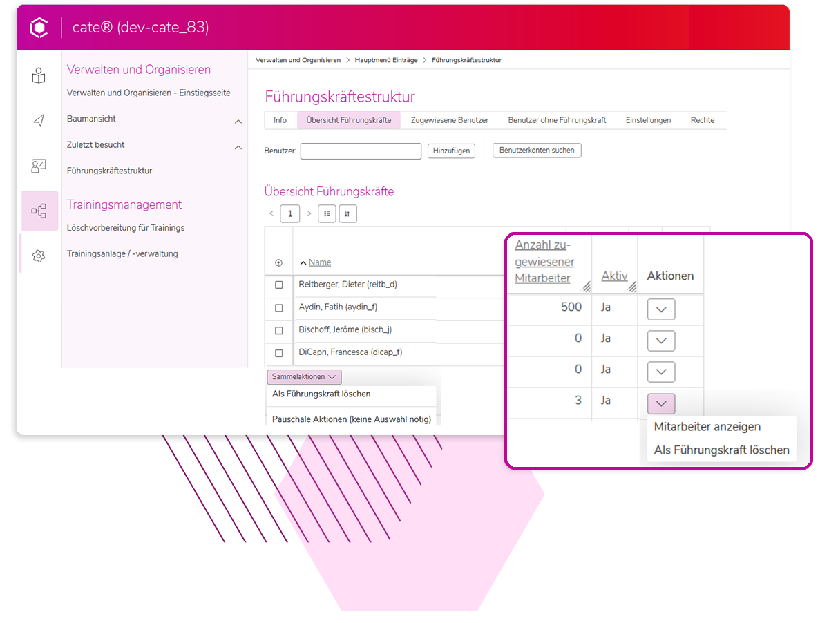Mit diesem neuen Feature können nun auch Light- und Standard-Kunden Führungskraft-Mitarbeiter-Beziehungen speichern. Die Führungskräftestruktur ist darauf ausgelegt, möglichst einfach bedienbar zu sein. Es gibt nur die Positionen Führungskraft und Mitarbeiter. Diese Positionen und Beziehungen können über die neue geschaffene Benutzeroberfläche verwaltet werden: