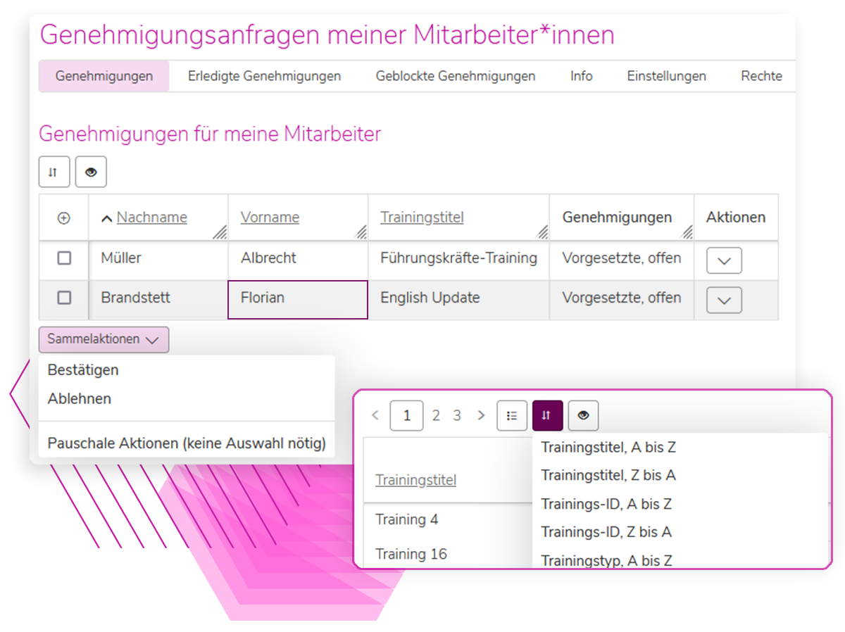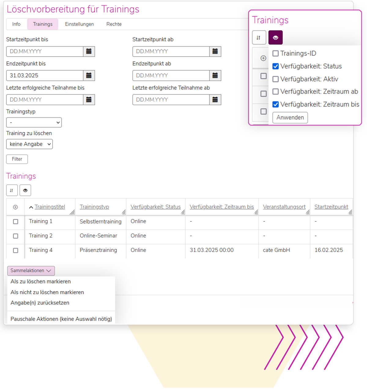 Es stehen verschiedene Filter zur Verfügung, um die Anzeige der gelisteten Trainings anzupassen:
